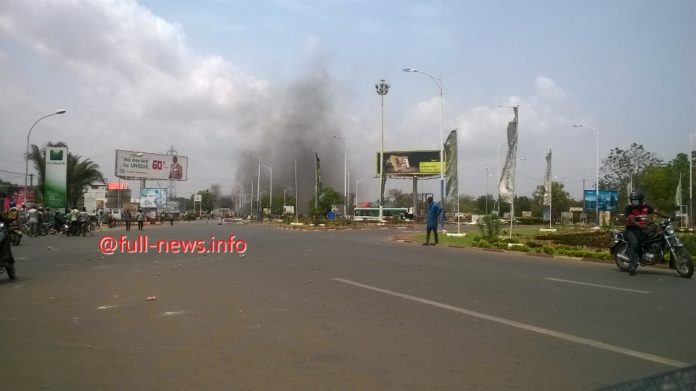 Le carrefour s’enflamme avec des jets de cailloux, des pneus brûlés et axes barrés. Une scène de révolte. Midi, un bus de la Sotral est brûlé. D’autres carrefours de la capitale sont bloqués.